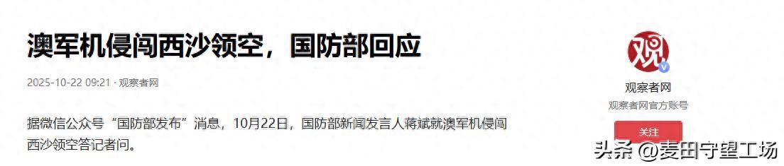 中国国防部新闻发言人在2025年10月22日对澳大利亚的说法进行严厉批驳,指出“澳方有关声明颠倒黑白,对中方倒打一耙,妄图掩盖其军机非法侵闯中国领空的恶劣行径,中方对此强烈不满,已向澳方提出严正交涉!”